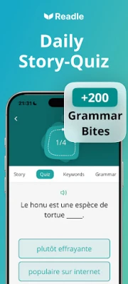 Readle on disainitud olema teie parim kaaslane keeleõppe teekonnal, pakkudes üle 2000 lühikese ja sisuka õppekursuse. Iga lugu on hoolikalt kureeritud keeleekspertide poolt, et pakkuda kontekstipõhist õpet. Täiustage oma hääldust, kuulates lause kaupa selget heli, mis parandab samal ajal ka teie kuulamisoskust. Kui kohtate tundmatut sõna, piisab sellele toksamisest, et näha kiiret tõlget – enam pole vaja aega raisata erinevate sõnaraamatute vahetamisele. See integreeritud sõnastik on vahetu ja efektiivne, muutes uue sõnavara, fraaside ja verbipöörete omandamise erakordselt lihtsaks.